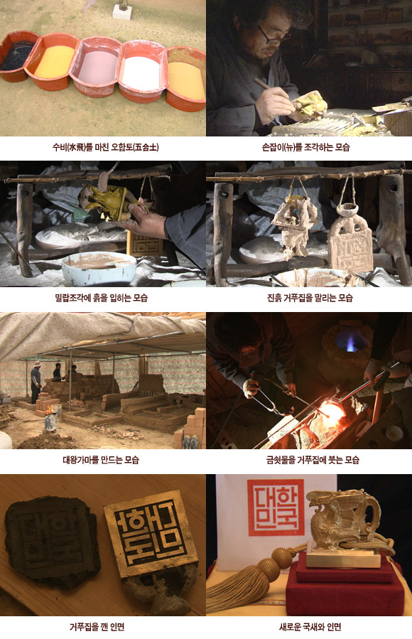국새제작의 가장 큰 특색은 주물방식이라는 점이다. 옥을 깎아 만드는 것도 아니고 현대적 주물도 아니고 전통 거푸집 방식이라는 점이다. 전통거푸집 양식이란 바로 밀랍을 이용한 납형주조법(蠟形鑄造法)을 말한다. 납형주조법이란 1)꿀벌이 벌집을 만들 때 분비되는 물질인 밀랍으로 조각을 하고, 2)그 위에 흙을 입혀 거푸집을 만들고, 3)거푸집이 마른 후 가마에 구워 밀랍을 녹여낸 후 4) 거푸집안에 쇳물을 녹여 부어 넣어 조각을 만드는 방식으로 청동기 시대의 청동거울이나 통일신라시대 에밀레 종 등의 제작방식을 말한다. 납형주조법은 밀랍에 섬세한 조각을 할 수 있어 최고의 주물 방식으로 평가된다. 에밀레 종의 섬세한 비천상 조각 역시 밀랍에 조각했기에 가능했다. 납형주조법에 대한 설명은 이처럼 간단하지만 실제 제작은 그리 간단하지 않다. 밀랍 거푸집을 가마에 넣어 구워야 하기 때문에 이에 필요한 가마의 제작이 필수적이며, 가마에서 높은 온도에 견딜 수 있는 거푸집 흙을 선별하는 것이 중요하기 때문이다.